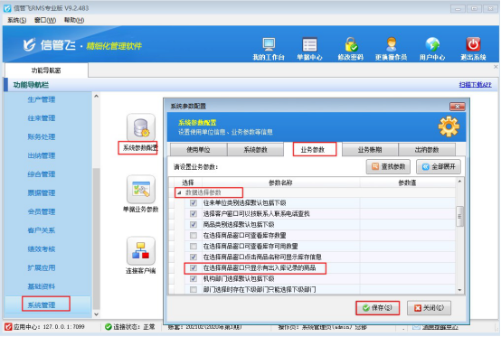 在功能導(dǎo)航窗點(diǎn)擊“系統(tǒng)管理”—》“系統(tǒng)參數(shù)”,選擇“業(yè)務(wù)參數(shù)”中數(shù)據(jù)選擇參數(shù)打開,勾選參數(shù)“在選擇商品窗口只顯示有出入庫(kù)記錄的商品”保存配置,如下圖所示: