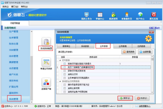 軟件默認允許“未審核”狀態(tài)的允許打印,在功能導(dǎo)航窗點擊“系統(tǒng)管理”—》“系統(tǒng)參數(shù)設(shè)置”,選擇業(yè)務(wù)參數(shù),把參數(shù)“處于“待審核”的單據(jù)可打印”取消勾選,然后保存配置,如下圖所示: