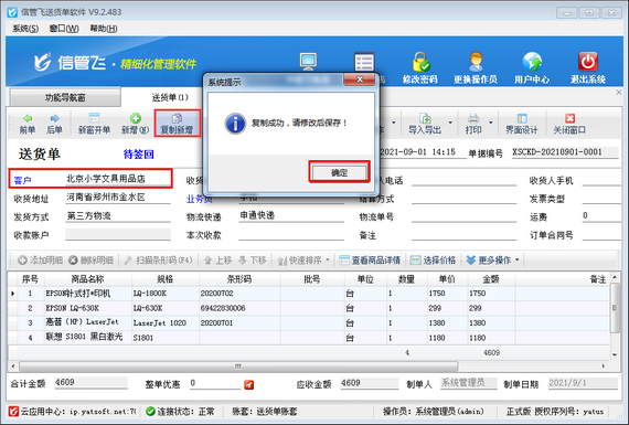 送貨單支持復制新增功能,可以選擇已確認開單的送貨單進行復制新增生成一個一模一樣的新單據(jù)。如下圖所示: