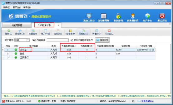 在功能導航窗,點擊“出納管理”——》“出納期末結帳”,進入“出納期末結帳”界面,選擇賬戶名稱“支付寶”,可看到當前賬期是2021-8月,如下圖所示:
