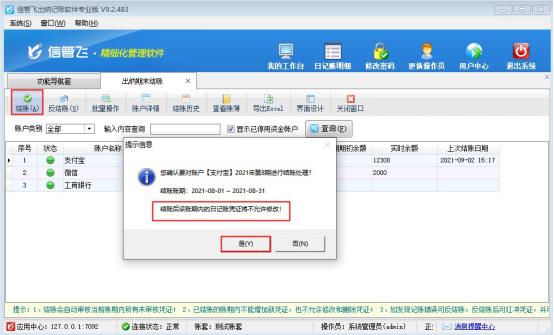 對資金賬戶“支付寶”進行結賬處理,選擇賬戶名稱為“支付寶”的記錄,點擊工具欄的“結賬”按鈕,系統會彈出提示“結賬賬期:2021-08-01~2021-08-31,結賬后該賬期內的憑證將不允許修改!”,點擊是,賬期會轉入下一賬期,如下圖所示: