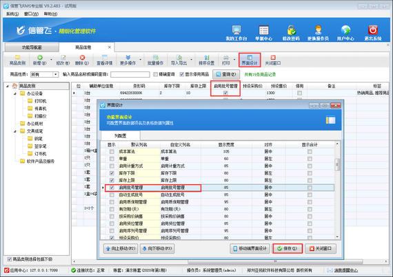 首先,在商品信息界面工具欄中點(diǎn)擊“界面設(shè)計(jì)”打開(kāi)界面設(shè)計(jì)界面,將“啟用批號(hào)管理”列配置顯示出來(lái),如下圖所示。