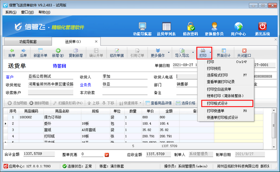 在功能導(dǎo)航窗點擊“新開送貨單”,新增保存一個單據(jù),在打印按鈕下點擊打印格式設(shè)計,可進(jìn)入打印格式設(shè)計界面。如下圖所示: