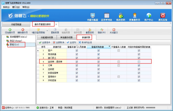 在功能導(dǎo)航窗點(diǎn)擊“系統(tǒng)管理”—》“操作員及授權(quán)”,進(jìn)入操作員及授權(quán)界面,選擇操作員“李拓”,在“數(shù)據(jù)權(quán)限”中,把“送貨單、退貨單”權(quán)限對(duì)應(yīng)的“可修改有查看權(quán)限的數(shù)據(jù)”選擇取消勾選,保存權(quán)限設(shè)置。如下圖所示: