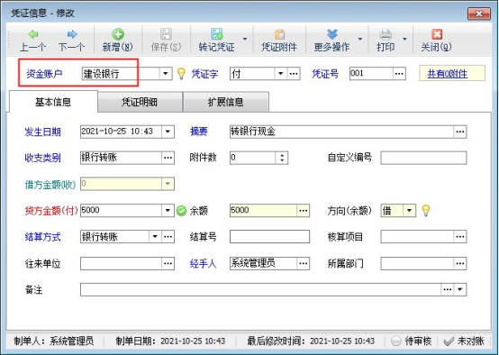 首先登記建設(shè)銀行的日記賬,銀行資金轉(zhuǎn)出,日記賬需要登記憑證字為“付”的憑證記錄,摘要和收支類別可選擇轉(zhuǎn)銀行現(xiàn)金,如下圖所示: