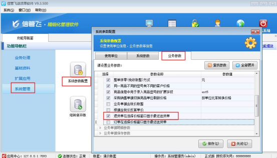 在功能導航窗點擊“系統管理”—》“系統參數配置”,把“業務參數”中的“退貨單在選擇價格窗口顯示最近送貨單”參數啟用保存,如下圖所示: