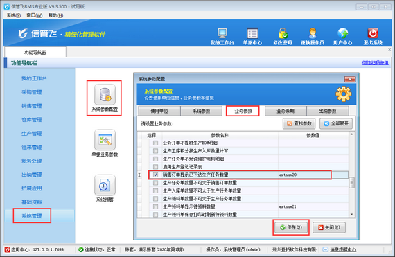 在功能導(dǎo)航窗點(diǎn)擊“系統(tǒng)管理”—》“系統(tǒng)參數(shù)配置”—》“業(yè)務(wù)參數(shù)”打開業(yè)務(wù)參數(shù)配置界面,然后在生產(chǎn)管理相關(guān)參數(shù)中打鉤啟用“銷售訂單顯示已下達(dá)生產(chǎn)任務(wù)數(shù)量”參數(shù),并設(shè)置參數(shù)值,默認(rèn)為“extnum20(擴(kuò)展數(shù)值20)”,如下圖所示。