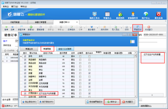 參數(shù)配置完成之后,打開銷售訂單,在“界面設(shè)計”—》“單據(jù)明細(xì)”中將“擴(kuò)展數(shù)值20”自定義列名為“已下達(dá)生產(chǎn)任務(wù)數(shù)量”,并勾選顯示出來,如下圖所示。