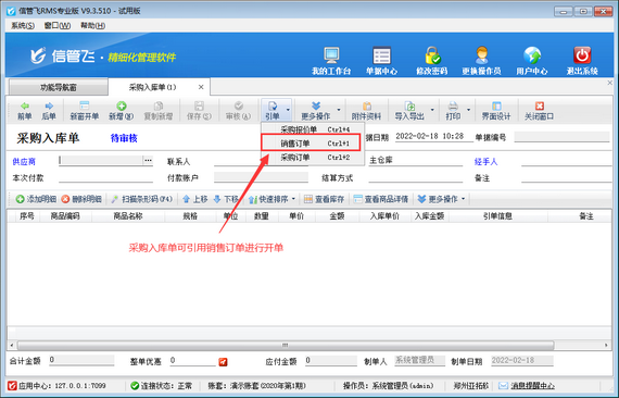 信管飛RMS(進(jìn)銷存管理軟件)支持根據(jù)銷售訂單進(jìn)行采購入庫進(jìn)貨(如下圖所示),同時(shí)也支持配置操作員采購入庫單引用銷售訂單開單權(quán)限,本篇文章介紹一下進(jìn)銷存管理軟件內(nèi)如何設(shè)置操作員開采購入庫單不可引用銷售訂單?