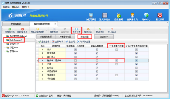在功能導航窗點擊“系統管理”—》“操作員及授權”,進入操作員管理及授權界面,選擇操作員“張亞”,在“數據權限”中,把“送貨單、退貨單”權限對應的“只查看本人數據”權限勾選啟用上,然后保存權限設置,如下圖所示: