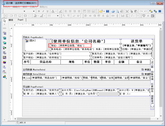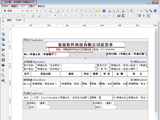一、默認(rèn)模板,公司地址調(diào)用系統(tǒng)參數(shù)使用單位信息中的內(nèi)容,模板設(shè)計(jì)界面(開單界面打印下選擇打印格式設(shè)計(jì),設(shè)計(jì)格式可查看)如下圖: