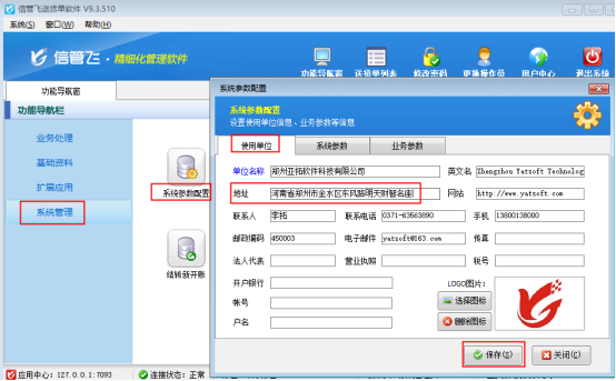 修改使用單位地址,需在功能導(dǎo)航窗選擇系統(tǒng)管理—》系統(tǒng)參數(shù)配置—》使用單位信息中修改后保存即可。如下圖所示: