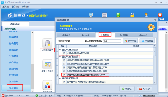 在功能導(dǎo)航窗點(diǎn)擊“系統(tǒng)管理”—》“系統(tǒng)參數(shù)配置”,在業(yè)務(wù)參數(shù)中勾選啟用參數(shù)“銷售單在選擇價(jià)格窗口顯示最近采購(gòu)入庫(kù)單”,保存參數(shù)配置,如下圖所示: