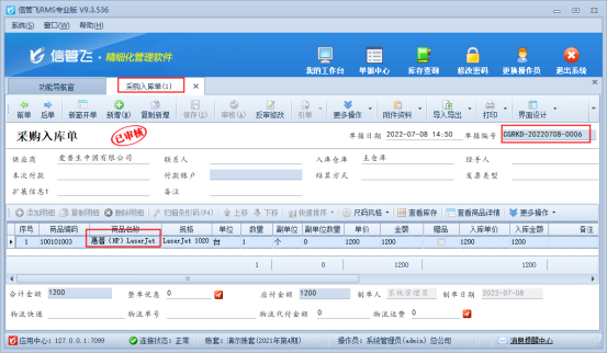 系統(tǒng)參數(shù)設(shè)置完成后,新增一張采購(gòu)入庫(kù)單,入庫(kù)商品“惠普(HP)LaserJet 1020”采購(gòu)價(jià)1200元,如下圖所示: