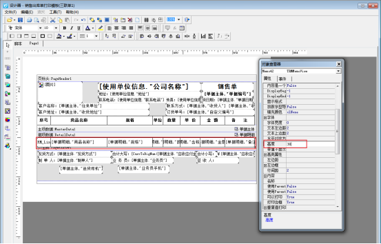 在開單界面,打印按鈕下點擊“打印格式設計”,在打印格式設計界面,點擊“設計格式”,可進入模板設計器界面,首先按住ctrl鍵,鼠標選中細項數據的所有文本框,右鍵點擊屬性,在屬性中找到高度,可以修改文本框的高度值;設置完成后,點擊細項數據處,右鍵點擊屬性,修改明細欄高度與之前文本框的高度一致,如下圖所示:
