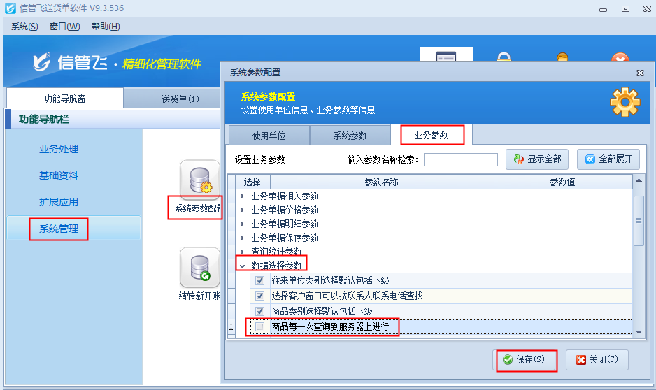 經檢查發現,原因是啟用了參數影響,解決辦法如下,在功能導航窗點擊“系統管理”—“系統參數配置”,在“業務參數”的選擇參數中取消勾選參數“商品每一次查詢到服務器上進行”,然后保存設置,如下圖所示:
