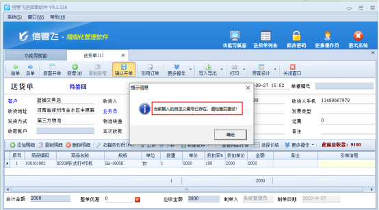 信管飛系列軟件支持開單保存自動生成對應(yīng)的單據(jù)編號,同時軟件支持開單錄入自定義編號(訂單合同號),有用戶存在多張單據(jù)使用相同訂單合同號,但保存第二張單據(jù)時提示“當(dāng)前輸入的自定義編號已存在,請檢查后重試!”,如圖: