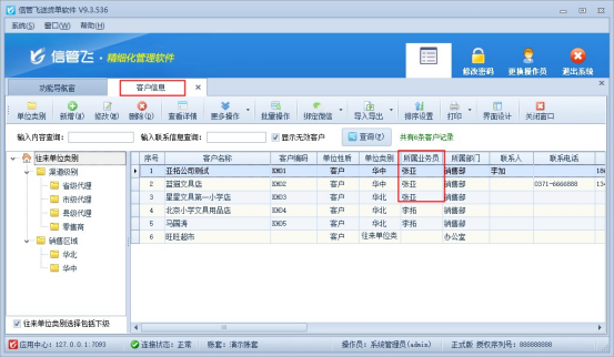 參數設置完成后,下一步需要維護客戶信息的所屬業務員,在“基礎資料”中打開“客戶信息”修改客戶選擇所屬業務員,示范業務員“張亞”,如下圖所示: