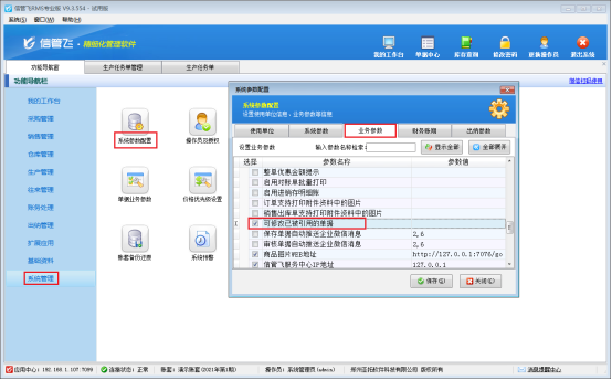 存在此提示信息是因?yàn)闃I(yè)務(wù)參數(shù)設(shè)置中未勾選參數(shù)“可修改已被引用的單據(jù)”影響,解決方法如下:在功能導(dǎo)航窗點(diǎn)擊“系統(tǒng)管理”—》“系統(tǒng)參數(shù)配置”—》“業(yè)務(wù)參數(shù)”,在特殊功能參數(shù)中,勾選參數(shù)“可修改已被引用的單據(jù)”然后保存配置,如下圖所示: