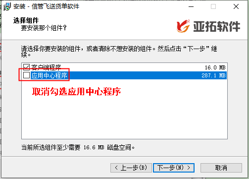 客戶端電腦安裝客戶端程序,安裝選擇組件界面,取消勾選安裝應(yīng)用中心選項,只安裝客戶端程序,如下圖所示:
