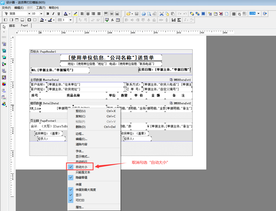 出現此問題的原因是:此文本框啟用了“自動大小”設置導致。打開模板設計器界面,在細項數據欄目選擇需要調整的文本框,鼠標點擊右鍵,在彈出的界面取消“自動大小”設置,然后保存打印格式模板,如下圖所示。
