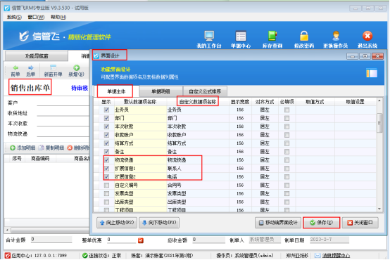 參數設置完成,“銷售管理”中打開銷售出庫單界面。點擊“界面設計”,單據主體中勾選“物流快遞、擴展信息1和擴展信息2”并上移至備注下邊,擴展信息1和擴展信息2修改自定義數據項名稱為“聯系人”和“電話”,如下圖所示:
