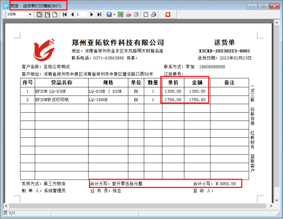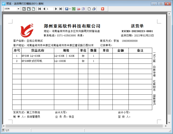 新開一個(gè)銷售出庫(kù)單,打印下點(diǎn)擊打印預(yù)覽,默認(rèn)模板“送貨單打印模版(B01)”預(yù)覽界面如下所示,含單價(jià)和金額。