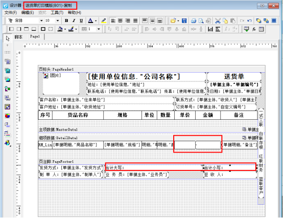 用戶需要打印一份一樣的無(wú)價(jià)格的模板,在銷售出庫(kù)單界面點(diǎn)擊打印下的“打印格式設(shè)計(jì)”,在打印格式設(shè)計(jì)界面,點(diǎn)擊“送貨單打印模板(B01)”,工具欄點(diǎn)擊“復(fù)制”,會(huì)生成一個(gè)“送貨單打印模版(B01)-復(fù)制”的模板,選擇此模板點(diǎn)擊“設(shè)計(jì)格式”,設(shè)計(jì)器界面刪除單價(jià)金額對(duì)應(yīng)的明細(xì)列調(diào)用數(shù)據(jù)項(xiàng),保存模板預(yù)覽可看到單價(jià)金額處為空顯示。如下圖所示: