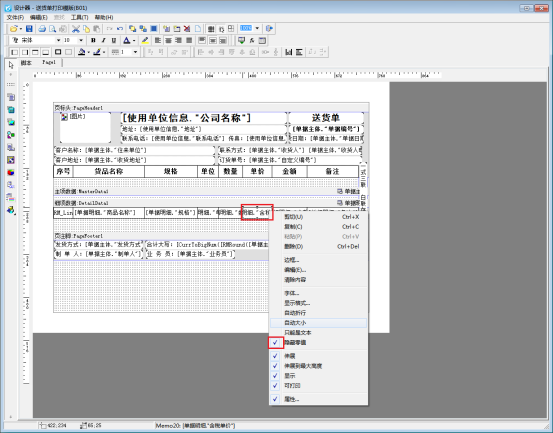 菜單欄點打印—》打印格式設(shè)計—》設(shè)計格式,進入打印模板設(shè)計器界面,選中單價、金額明細欄,鼠標(biāo)右鍵勾選隱藏零值,勾選之后點擊保存。