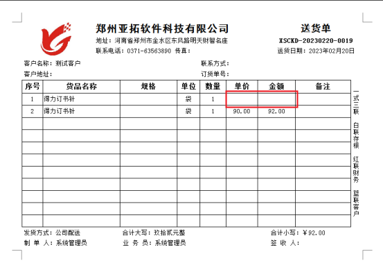 信管飛RMS軟件、信管飛倉庫管理軟件、信管飛送貨單軟件等支持自定義設(shè)計打印模板,送貨單軟件中自帶了十幾種打印模板樣式,部分用戶在設(shè)計模板時需要單據(jù)單價、金額為0時,模板中零值不顯示,以送貨單軟件為例設(shè)置下打印模板明細欄如何不顯示零值。未調(diào)整前打印模板顯示如下: