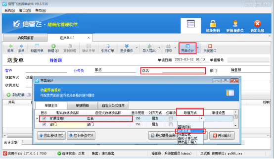 有用戶存在多家門(mén)店的情況,需要按照每家門(mén)店進(jìn)行明細(xì)匯總統(tǒng)計(jì)。以“送貨明細(xì)對(duì)賬單”為例,示范下如何在界面設(shè)計(jì)中配置。首先在功能導(dǎo)航窗選擇“業(yè)務(wù)處理”進(jìn)入新開(kāi)送貨單界面,點(diǎn)擊“界面設(shè)計(jì)”按鈕,在打開(kāi)的界面設(shè)計(jì)窗口中找到“擴(kuò)展信息1”數(shù)據(jù)項(xiàng),可自定義列名為店名,擴(kuò)展信息1(店名)可以使用數(shù)據(jù)字典維護(hù),開(kāi)單方便直接選擇,如下圖所示: