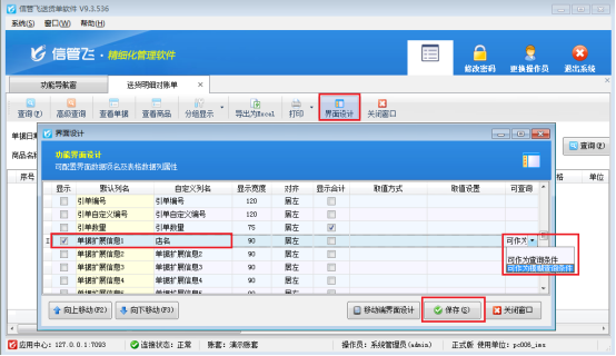 功能導(dǎo)航窗選擇“業(yè)務(wù)處理”在右側(cè)的查詢統(tǒng)計(jì)下打開(kāi)“送貨明細(xì)對(duì)賬單”進(jìn)入送貨單明細(xì)查詢界面,點(diǎn)擊“界面設(shè)計(jì)”按鈕,在打開(kāi)的界面設(shè)計(jì)窗口中找到“擴(kuò)展信息1”數(shù)據(jù)項(xiàng),勾選顯示并在可查詢處設(shè)置“可作為模糊查詢條件”,然后保存設(shè)置,如下圖所示: