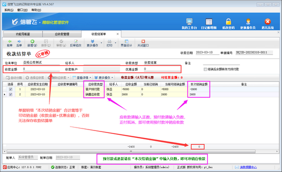 在應收款管理界面工具欄點擊“收款結算”按鈕,可以打開收款結算單對客戶預付款/銷售應收款進行收款結銷。如下圖所示,客戶“亞拓公司測試”應收金額2600元,客戶預付款5000元,在單據明細“本次結銷金額”中,銷售應收款輸入2600,客戶預付款輸入-2600,正負抵消,即可使用客戶預付款沖銷銷售應收款。