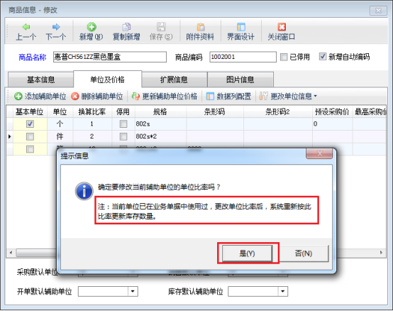 未開單使用過的輔助單位可以在單位及價格界面,單位、換算比率處直接進行修改。