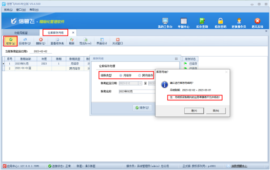 信管飛RMS軟件、信管飛倉庫管理軟件最新版增加庫存月結(jié)功能,可按月或跨月進(jìn)行庫存結(jié)存,結(jié)存后可直接調(diào)整庫存數(shù)量及庫存成本。本文以信管飛RMS專業(yè)版為例示范下如果操作。