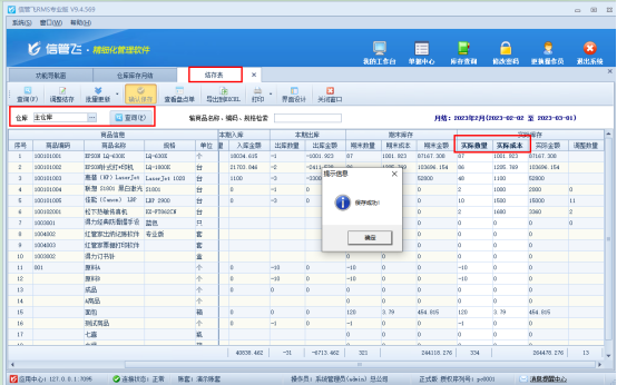 結(jié)存成功后,在倉庫庫存月結(jié)界面生成一個“已結(jié)存”的記錄。選擇“已結(jié)存”的結(jié)存記錄。點(diǎn)擊工具欄“查看結(jié)存表”,可進(jìn)入“結(jié)存表”界面,在結(jié)存表界面,需要調(diào)整庫存數(shù)量和庫存成本,選擇需要調(diào)整的倉庫,點(diǎn)擊“查詢”刷新,在實(shí)際庫存中直接修改“實(shí)際數(shù)量”和“實(shí)際成本”,修改后會自動生成已審核的盤點(diǎn)單,如下圖所示: