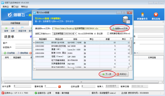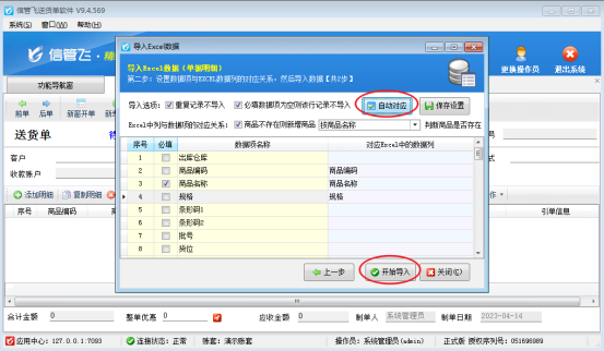 在功能導(dǎo)航欄業(yè)務(wù)處理--新開送貨單,點(diǎn)擊新開送貨單進(jìn)入開單界面,工具欄“導(dǎo)入導(dǎo)出”按鈕下拉列表選擇“從EXCEL導(dǎo)入明細(xì)”,第一步:選擇要導(dǎo)入的excel文件點(diǎn)擊下一步,第二步:設(shè)置數(shù)據(jù)項(xiàng)與excel數(shù)據(jù)列的對應(yīng)關(guān)系,點(diǎn)擊自動對應(yīng),沒有自動對應(yīng)請手動設(shè)置對應(yīng)關(guān)系,點(diǎn)擊開始導(dǎo)入,如圖所示: