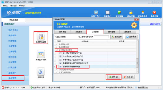 功能導(dǎo)航欄點(diǎn)擊“系統(tǒng)管理”-》“系統(tǒng)參數(shù)配置”,進(jìn)入系統(tǒng)參數(shù)配置界面,業(yè)務(wù)參數(shù)界面會(huì)計(jì)憑證相關(guān)參數(shù)下勾選參數(shù)“顯示財(cái)務(wù)處理輔助單據(jù)”,勾選之后點(diǎn)擊保存。