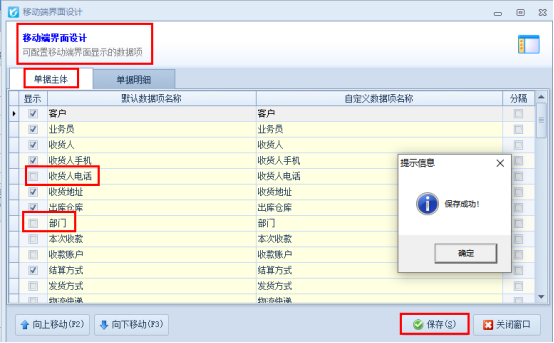 在移動端界面設計界面,單據主體項中可取消勾選“收貨人電話”和“部門”選項,然后保存界面設計,如下圖所示: