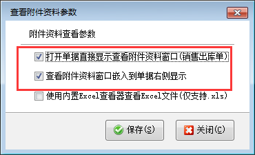 以銷售出庫(kù)單為例,在銷售出庫(kù)單界面工具欄點(diǎn)擊“附件資料”—》“查看附件資料參數(shù)”,可打開“查看附件資料參數(shù)”窗口,如下圖所示。