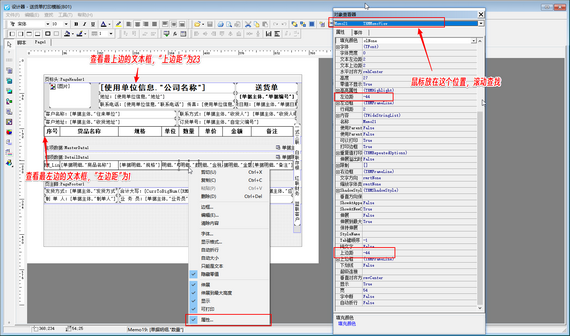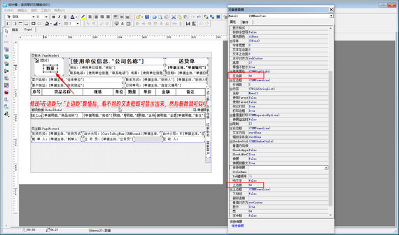然后修改查找到的文本框“上邊距”及“左邊距”數值,修改“上邊距”數值大于最上邊的文本框“上邊距”數值,修改“左邊距”數值大于最左邊的文本框“左邊距”數值,修改完成后,此數據項在打印模板設計器內即可顯示出來,然后刪除此文本框就可以,如下圖所示。