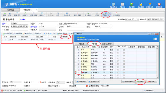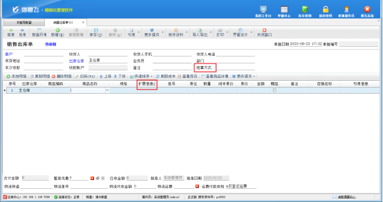 打開一個單據界面,單據由單據主體和單據明細兩部分組成,以“結算方式”和“擴展信息2”為例,示范下如何把這兩項在開單界面取消顯示。