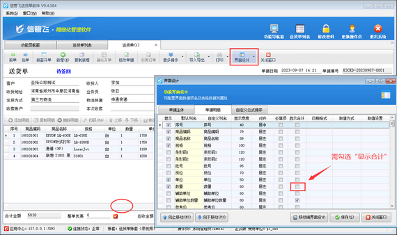 解決方法:在送貨單界面工具欄點(diǎn)擊“界面設(shè)計(jì)”,選擇單據(jù)明細(xì),找到“數(shù)量”數(shù)據(jù)項(xiàng),將數(shù)量“顯示合計(jì)”勾選上,然后保存界面設(shè)計(jì),如下圖所示。