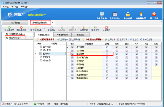 本文以“信管飛送貨單軟件”為例進行示范,在功能導航窗點擊“系統管理”—“操作員及授權”,設置操作員“張亞”基礎資料商品信息取消新增權限,如下圖所示: