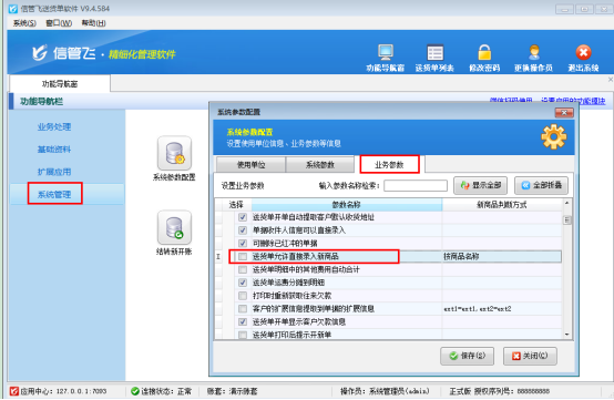 權限設置后保存設置,在“系統管理”—系統參數配置中“業務參數”,取消勾選參數“送貨單允許直接錄入新商品”并保存參數,如下圖所示: