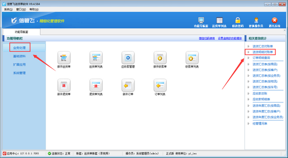 信管飛送貨單軟件通過狀態控制實現簡單的流程管理(待簽回—》已簽回—》已過賬),如下圖所示。本篇文章介紹一下如何設置送貨明細對賬單界面可顯示送貨單“簽回狀態”?