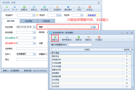 參數設置完成后,重新登記出納憑證時,即可輸入摘要內容,如下圖所示。