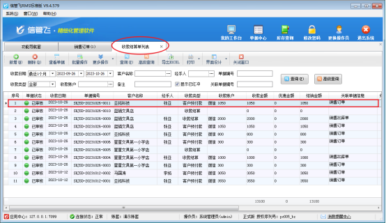 信管飛RMS標準版和專業(yè)版中增加了出納模塊,可以登記現(xiàn)金銀行日記賬。信管飛RMS軟件中用戶在做收款結(jié)算后如需要把這筆賬管理到日記賬中,可以在收款時轉(zhuǎn)記到出納日記賬中。