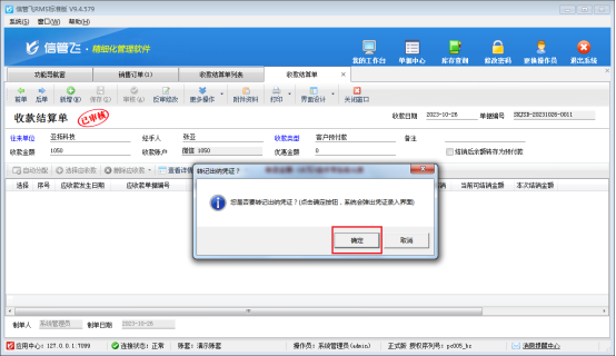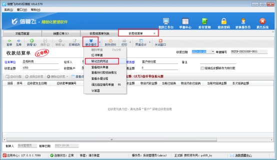 在收款結(jié)算單“更多操作”下點擊“轉(zhuǎn)記出納憑證”,點擊“確定”會彈出出納憑證新增界面,點擊保存即可,如下圖所示: