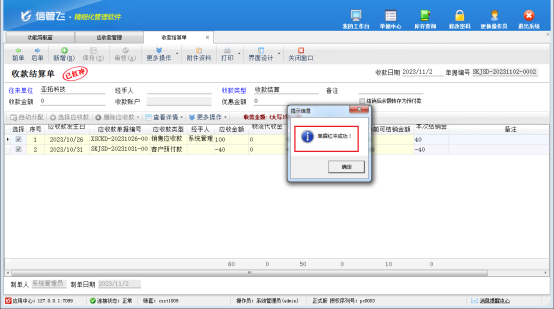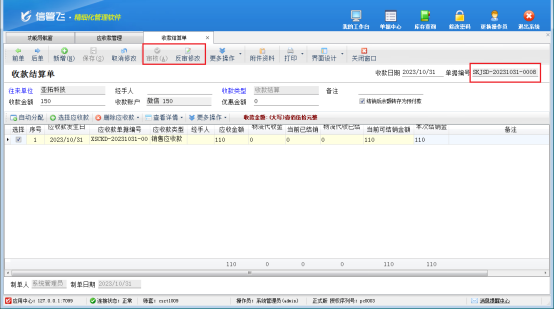 然后,選中此已結銷的客戶預付款記錄,在工具欄點擊“查看結銷”—》“查看結算單”,打開此客戶預付款的結銷記錄,更多操作下將此客戶預付款結銷記錄先紅沖后刪除,此時單據編號為“SKJSD-20231031-0008”的收款結算單即可反審修改成功,如下圖所示。